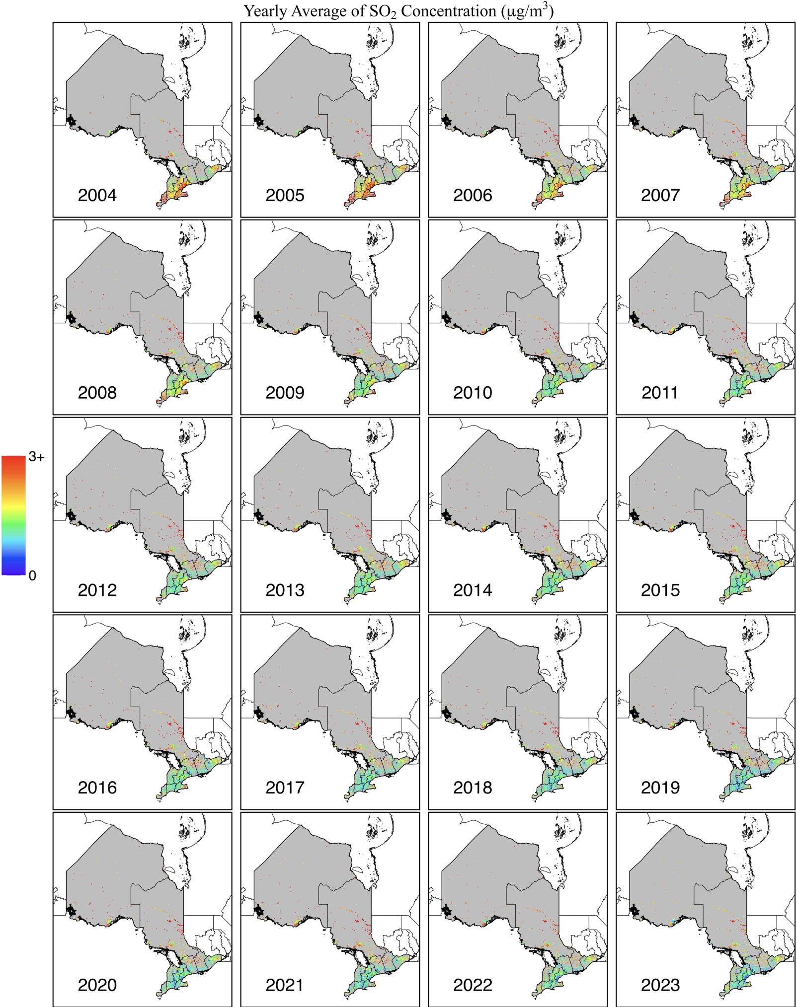 Sulfur Dioxide (SO2) concentrations over Ontario are now provided at a daily scale through a full-coverage 0.1° x 0.1° gridded map, spanning from 2004 to 2023. The SO2 dataset was developed using two trusted reanalysis datasets: EAC4 and MERRA-2. Meteorological data from ERA5-land, along with ground-based measurements, were used to train the Light Gradient-Boosting Machine, enhancing the accuracy of SO2 estimates. To compensate for the limited ground-based SO2 monitoring stations in Ontario, the model incorporated SO2 data from nearby areas to provide an initial estimate for the region. The model also utilized rich spatiotemporal data from surrounding grids and previous or subsequent days to improve the overall accuracy of the SO2 concentration predictions.