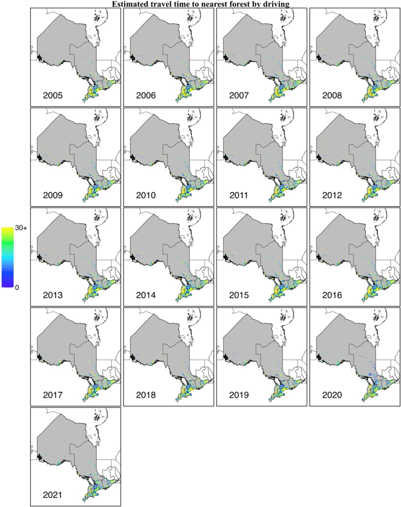 - Annual travel time estimates to the nearest forest by driving (mins)