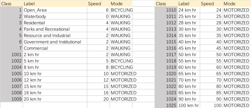Scenarios Table: defines travel speed and mode of transportation (WALKING, BICYCLING, or MORTORIED) for Land Cover and Road Speed Classes.