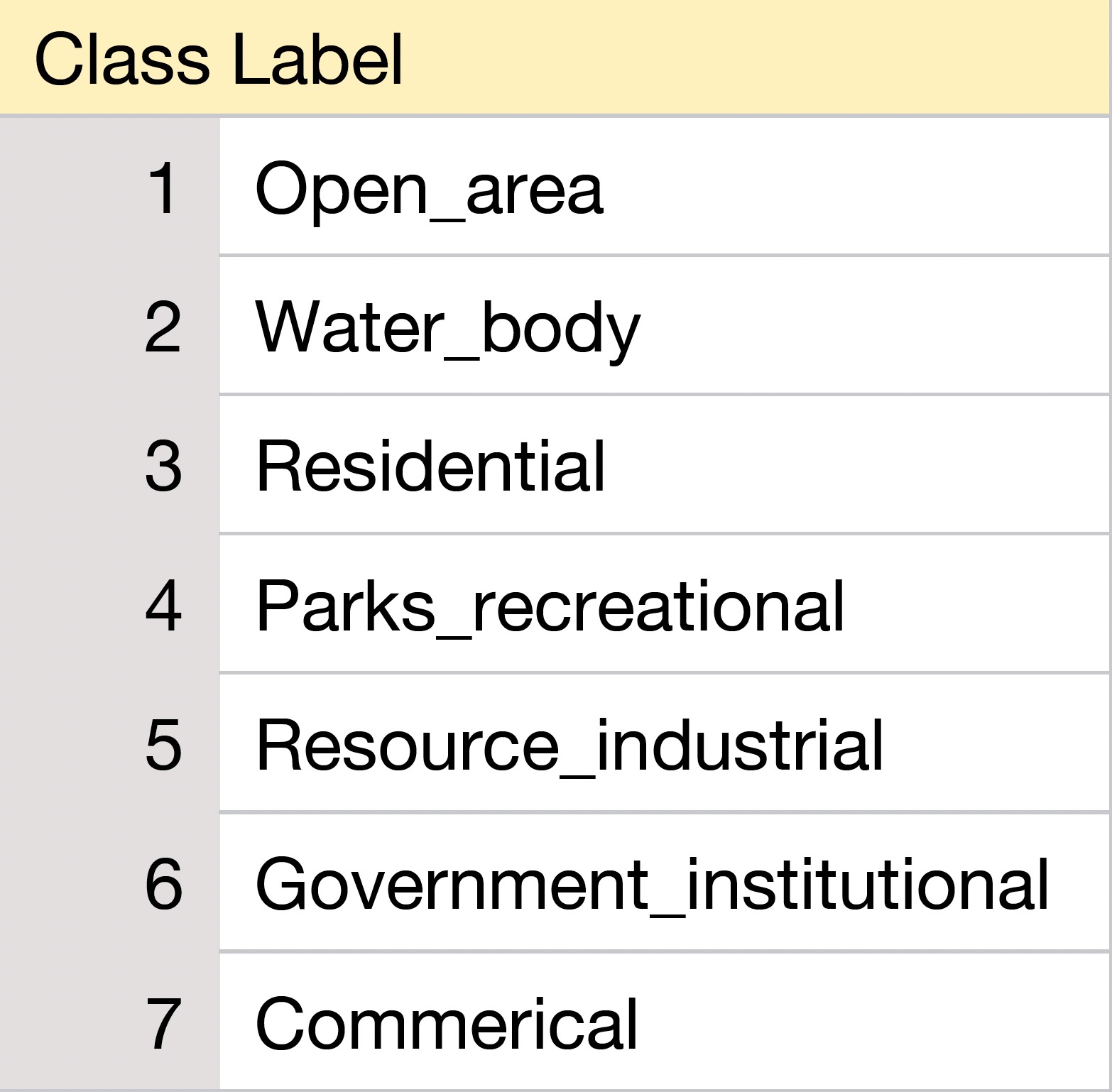 Ontario Land Cover (raster): a land cover distribution grid containing broad land cover types and their spatial arrangements. Each cell is identified as a Class ID number corresponding to one of seven possible types: