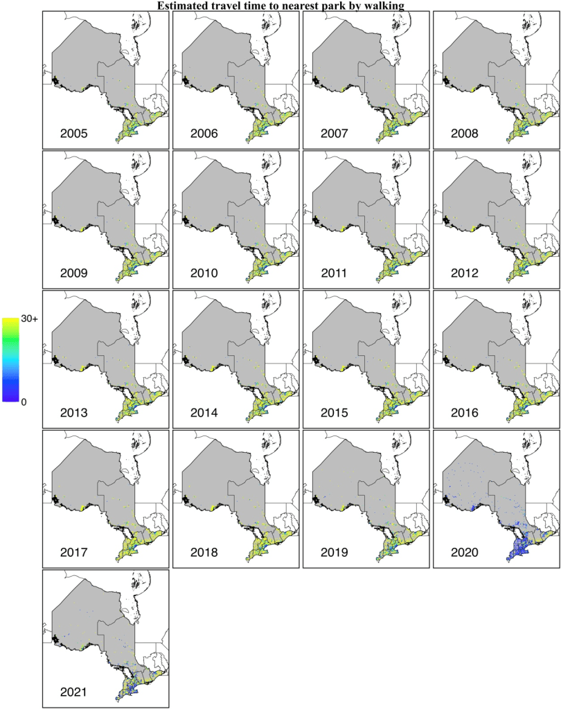 The dataset on travel times for the nearest parks by walking is created by considering landscape constrains and a travel scenario that defines the travel speeds for each land cover class.